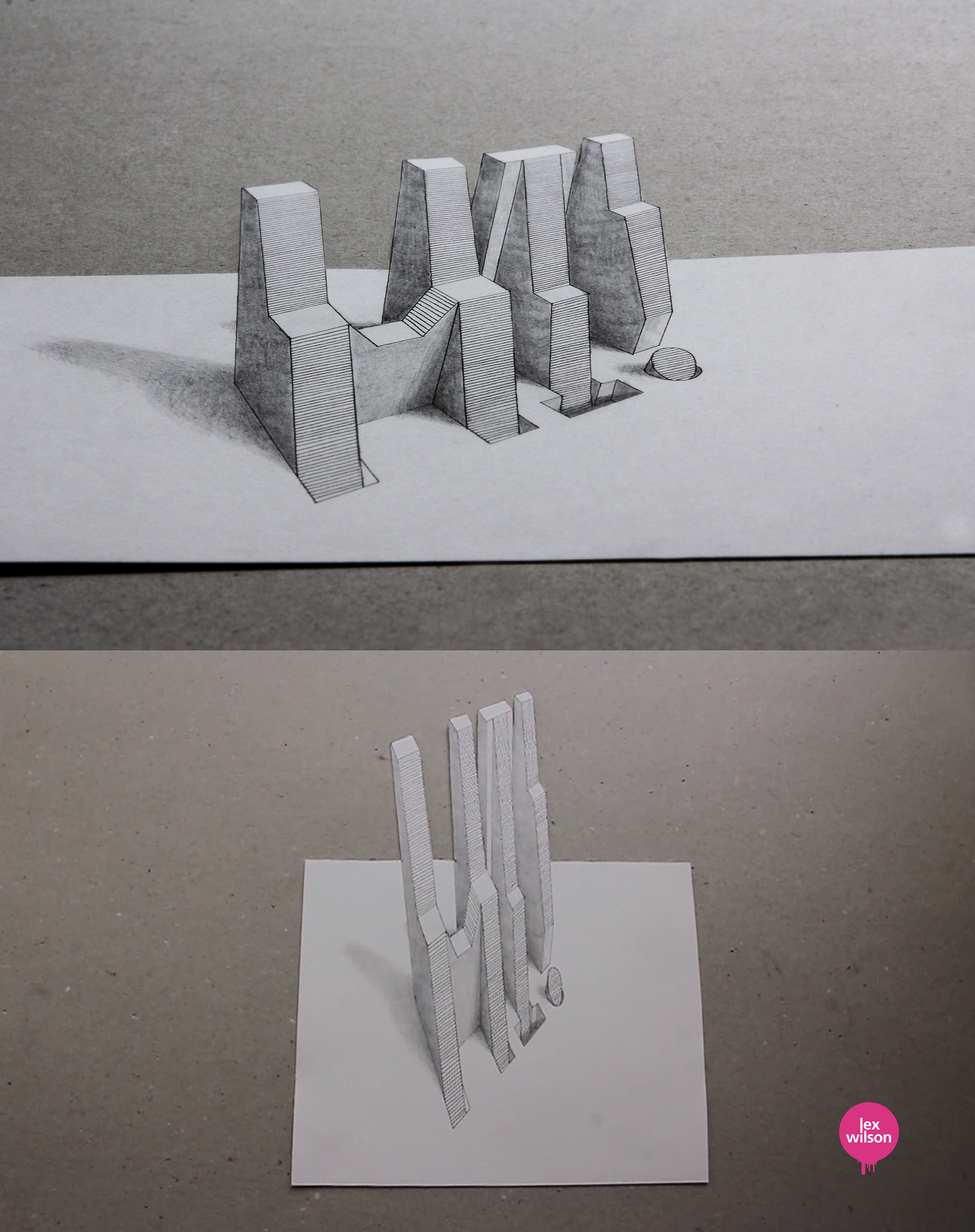 The top image shows the artwork at the intended perspective. The lower image shows the artwork directly from above drawn in anamorphic projection.
